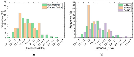 Figure 5. Hardness distribution of (a) cracked grains on crack path compared to bulk uncracked material, and (b) indents located within grains, within twins, and on GBs.