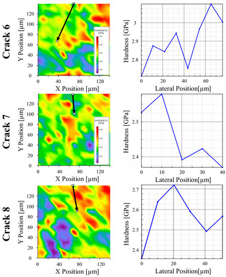 Figure 8. NanoBlitz maps with corresponding intergranular line scan hardness profiles along the arrowed paths of cracks #6–#8.