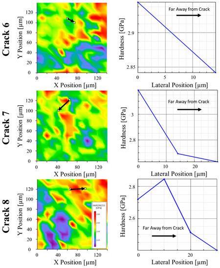 Figure 9. NanoBlitz maps with corresponding intragranular line scan hardness profile along the arrowed path from the crack to the GB within a cracked grain for cracks #6–#8.