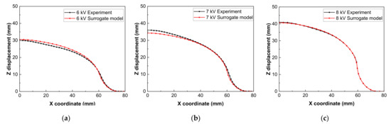Comparison results of experiment and surrogate model (a) 6 kV, (b) 7 kV, and (c) 8 kV.