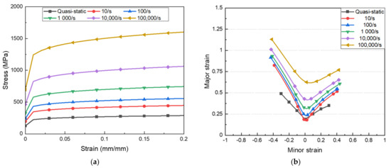 Dynamic properties of Al 6014-T4: (a) true stress–strain curve, (b) forming limit diagram (FLD).
