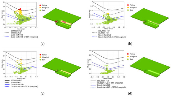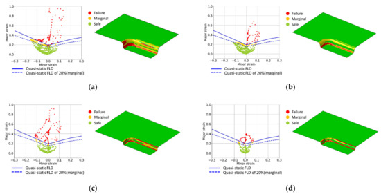 FLD and formability evaluation of drawing process for (a) CASE 1, (b) CASE 2, (c) CASE 3, and (d) CASE 4.