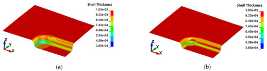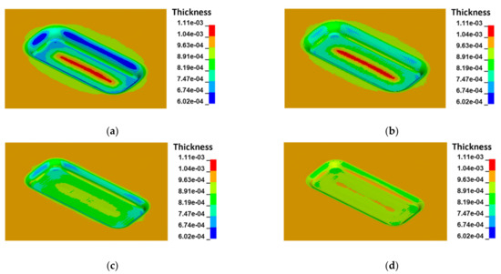Final thickness of the drawing process for (a) CASE 1, (b) CASE 2, (c) CASE 3, and (d) CASE 4.