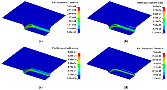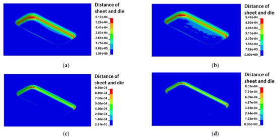 Distance between sheet and die (forming accuracy) for (a) CASE 1, (b) CASE 2, (c) CASE 3, and (d) CASE 4.