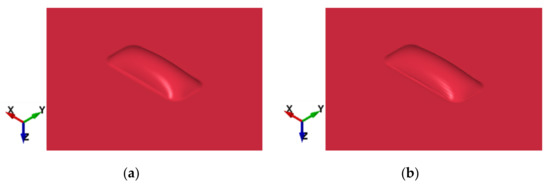Comparing the final shapes of the graphs (Figure 12) of free bulges 1 and 2, free bulge 1 has a higher final molding height than free bulge 2. The final molding heights of free bulge 1 and free bulge 2 are approximately and , respectively, with a difference of approximately . This is because of the difference in the amount of sheet inflow; more sheet inflow was seen in free bulge 1 than 2. This difference in sheet inflow is due to the following reasons. The cross-sections of the x-axis and y-axis of free bulges 1 and 2 and the amount of sheet inflow shown in Table 8 show that the final shape is determined by die R regardless of the overall shape of the die for EMF. If the die R is large, it is smoothly stretched along the curvature, forming proceeds, and the inflow of the plate material is relatively smooth. On the other hand, when the die R is small, rather than being formed along the curvature, the position of the plate is fixed while the plate is formed as if it is bent, and hence, the inflow of the plate is relatively difficult. If there is no inflow of sheet, the limit of deformation is also reduced because it deforms only with a limited sheet. Hence, the smaller the die R in the same model, the lower the forming accuracy.