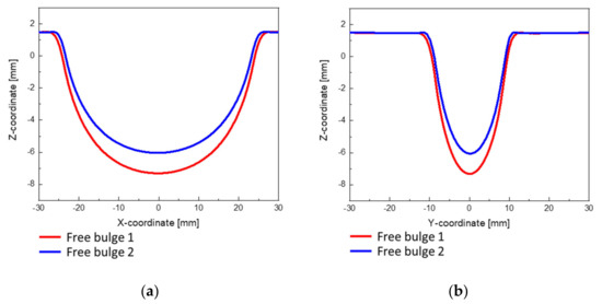 Through the finite element analysis results, it was confirmed that the EMF had low accuracy with the target shape at the corner areas of the die. In addition, the deeper the target forming depth and the smaller the die R, the lower the accuracy of the target shape. To understand the cause of this, a free bulge die was applied instead of a square cup-shaped die. This is used to determine the shape that the forming coil gives the sheet. Through the free bulge finite element analysis results, the characteristics of EMF were identified by analyzing how EMF was formed. Similar to the die R of the existing case, finite element analysis was additionally performed for free bulge 1 with die R and free bulge 2 with die R . Then, the finite element analysis was performed by lowering the input voltage from to . The final shape of the free bulge analysis is shown in Figure 11, and the sheet is formed into a hill-like shape after EMF. Therefore, the z-axis cross-section of the free bulge has an ellipse-like final shape. In addition, through Figure 12, which presents the x-axis and y-axis sections of the final shapes of free bulges 1 and 2, the z-axis section, that is, the size of the ellipse, becomes smaller as it goes down to the final shape. Therefore, EMF causes an unformed phenomenon in the corner area, and the greater the forming depth, the lower the forming accuracy.