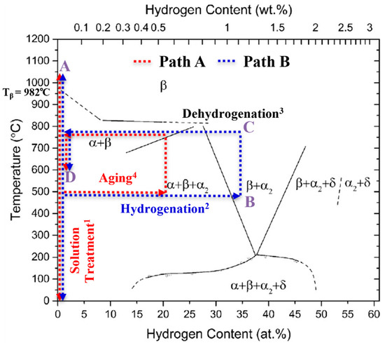 Hydrogen-induced effects that influence the microstructure (extrinsic H effects) can have a positive impact on the mechanical properties of the material. The extrinsic H effects can be described by two main phenomena: Firstly, hydrogen is a strong β-stabilizing element in Ti alloys and lowers the β-transus temperature Tβ to Tβ (H) (see Figure 1). Hence, the temperature of solution treatment can be lowered, reducing grain growth during the process as compared to conventional heat treatment (solution treatment and aging) of Ti alloys, if hydrogenation is applied before the ST. Secondly, when the hydrogenation concentration in a sample exceeds the maximum hydrogen solubility, hydrogen evokes hydride formation, which is associated with local volume expansion. The hydride-induced volume expansion in the α and β phase reaches a value between 17% and 25%, depending on the underlying solid solution (chemical composition) [5]. After the hydrides are dissolved during dehydrogenation, dislocations and vacancies remain, which act as additional nucleation sites for precipitates. This phenomenon enhances the α precipitation (and thus a more homogeneous and finer precipitate morphology) as well as the recrystallization kinetics (and thus a potentially reduced grain size) during a subsequent heat treatment [6]. Previous work on THT has led to increased strength under cyclic and static loading by producing a homogeneous and, compared to conventionally heat-treated Ti alloys, finer microstructure [7,8].