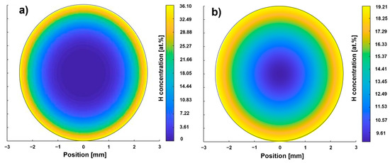 The hydrogen concentration profile according to path A (Figure 3a) shows a maximum local hydrogen concentration of 36.10 at.% at the surface. The depth at which the H content is sufficient to enable hydride precipitation (15 at.%) is referred to in the following as penetration depth and is less than 750 µm. The result shows that an area in the center with a diameter of 3 mm is between 0 and 7 at.%. The hydrogen concentration at the surface of the sample of path B is lower (19.21 at.%, Figure 3b) than the one of path A, while the penetration depth is larger (approx. 1000 µm). The center of the path B sample exhibits half of the surface concentration. Hence, these calculation results are in reasonable agreement with what the hydrogenation parameter suggests: that THT path A was executed at a higher hydrogen partial pressure, resulting in a higher saturation concentration [15] and therefore enabling a higher hydrogen uptake at least in near-surface areas. The significantly longer hydrogenation duration of path B results in a larger penetration depth as well as a larger hydrogen concentration in the center. According to both hydrogen concentration profiles, the hydrogenation parameters of both paths seem to allow the adjustment of a hydrogen concentration gradient. Figure 4 compares the hardness profiles (HV2 versus distance to surface) of the two paths after hydrogenation and dehydrogenation with the hardness profile of the solution treatment condition (ST).