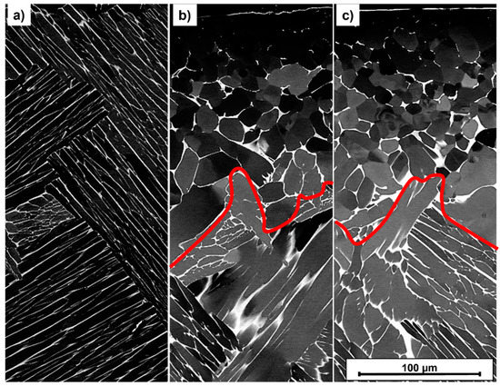 SEM-BSE Micrographs of the near-surface area (sample’s surface is located on top) after solution treatment A (a) and THT acc. to path A (b) and path B (c); the red line indicates the boundary between equiaxed and lamellar grain morphology.