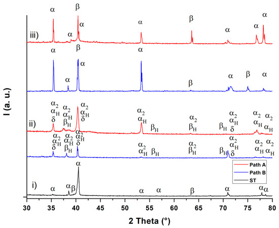 The larger penetration depth is measured in the path B sample, the smaller α particle size in the near-surface area in the path A sample (Table 6). In the areas far from the surface (140–420 µm distance to surface and at center), no significant difference in α particle size can be detected between the two THT paths, although the path B sample reveals a larger particle size in the center. This can be explained by the fact that the significantly longer hydrogenation time of the path B sample results in a larger driving force of grain growth during hydrogenation. The investigated THT processes thus induce a microstructure gradient. However, it must be verified in further investigations whether and to what extent this improves the mechanical properties. The corresponding phase analysis after THT is depicted in Figure 6 in terms of XRD diffractograms.