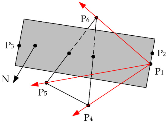 As shown in Figure 6, the three vertices of the triangular patch are defined as P4 (x4, y4, z4), P5 (x5, y5, z5), and P6 (x6, y6, z6), and the three vertices constitute the vectors P1P4, P1P5, and P1P6 with the point P1 on the tangent plane; thus, the judgment formula is written as