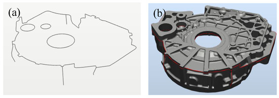 STL is a file format for describing three-dimensional graphics [20], which represents the three-dimensional graphics as several triangular patches. Before acquiring the STL file of the flywheel shell, it is necessary to determine the contour curve segment according to its features and task requirements. As shown in Figure 1, the flywheel shell’s flash and burrs are mainly distributed on the upper edges, and the geometric features of the task path are characterized by straight lines, curves, and circles. Accurately extracting the contour curve of the flywheel shell is critical to task path generation.