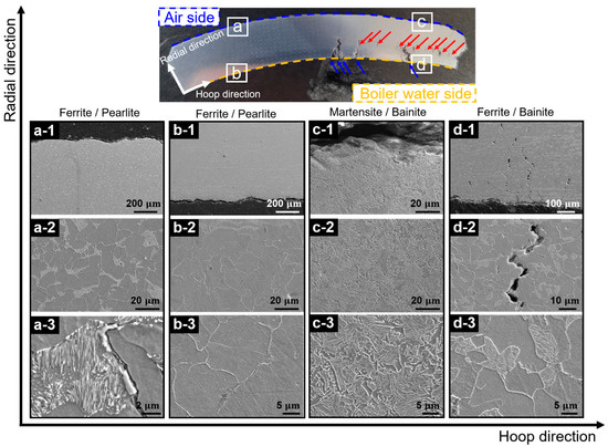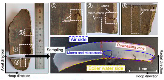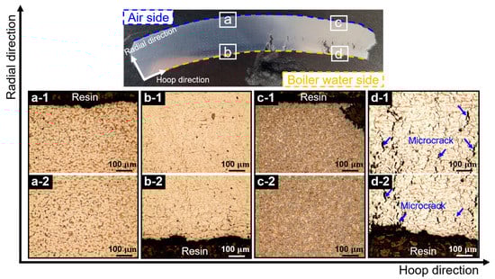 The shape of the damaged (fractured) tube was oval, and the size had a length of ~100 mm along the axial direction, a width of 45 mm along the hoop direction, and a thickness of 6 mm along the radial direction (Figure 2). We could not find any reduction in thickness, but we found macro- and microcracks that originated only on the water-facing side. The cracks were generally propagated along the axial and radial direction, and a few cracks were observed along the hoop direction near the fracture surface (Figure 2). Most cracks were found in the overheated zone, especially near the boiler water-facing side (Figure 2). It is known that the overheated region by the flame induces a nonuniform thermal gradient through the tube, which can generate compressive residual stresses in the air side and tensile residual stresses in the boiler water side [18,20]. In addition, it is recognized that a boiler environment at high temperature can cause hydrogen embrittlement accompanied by decarburization [22].