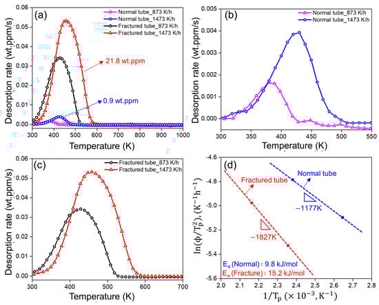 TDS analysis of normal and fractured tubes: (a–c) hydrogen desorption rate vs. temperature, (d) calculation of activation energy of trapping sites using a Kissinger equation.
