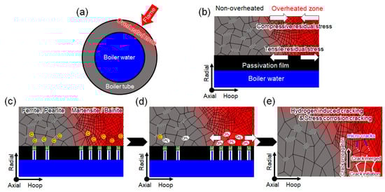 Crack initiation and failure mechanism for the water wall tube boiler: (a) the initial state of the tube, (b) the development of residual stress, (c) the penetration of hydrogen, (d) decarburization, and (e) crack initiation and propagation.