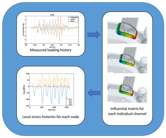 In the first step, the loading spectra corresponding to selected obstacles were measured using accelerometers. FEM analysis was used to calculate stress in the critical place corresponding to each loading channel measured. For each loading channel, an influence matrix was used to transform measured acceleration into stress history in the critical place. As a linear model was used, a linear combination of stresses caused by each channel defined the stress history in critical places.