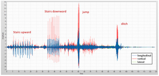 The relevant obstacles were identified (riding across a ditch, riding down stairs and jumping from a height of 0.6 m). The maximal acceleration for each obstacle and each direction is shown in Table 1.