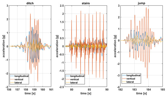 Filtered signals for each obstacle type, from left to right: ditch, stairs and jump.