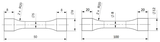 The material parameters for both AlSi10Mg variants were obtained experimentally. The experiment was carried out in the strength and elasticity laboratory for operational lifetime and materials testing of the Faculty of Mechanical Engineering, STU. An MTS Bionix 370.02 axial/torsional testing system was used. The geometry utilized for the AM-produced specimens and the geometry utilized for the conventionally cast specimens are shown in Figure 7.
