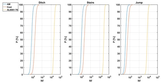 The fatigue life (Nf) is described by the number of repetitions of the loading signals representing each obstacle. The results of Nf, corresponding to the regress line of material parameters, for AM AlSi10Mg, cast AlSi10Mg and Al6061 are summarized in Table 6.