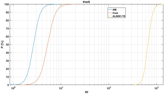 The distribution function of fatigue lifetime for each material corresponding to the hypothetical track proposed in Section 2.2 is presented in Figure 12. Each line represents one of the analysed materials.