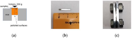 Joint indentation scheme: (a) samples are clamped in vice polished surfaces to each other; (b) a sample cut from HPT n = 1 BMG; (c) samples are clamped in a vice.