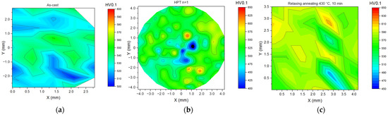 Microhardness distribution: (a) in the initial sample; (b) after HPT n = 1; (c) after relaxing annealing at 430 °C, 10 min.