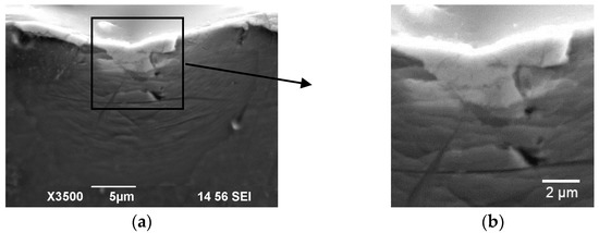 The SEM analysis of the BMG surface after indentation into the joint showed that in the initial state, the formation of numerous concentric SBs around the indenter was observed (Figure 5b). A similar formation pattern of SBs was also observed at the interface of BMG Vit106 [33]. The characteristics of the formed pattern (the distance from the tip of the indenter to the farthest observed band (far-end), the number, and the average distance between the bands for each state) are presented in Table 2. One can see that in the initial BMG state, the average distance between the concentric bands is about 0.5 microns. As known, SBs are the main carriers of deformation in amorphous materials and the pattern of band formation corresponds to the pattern of stress and strain distribution during indentation according to simulation data.