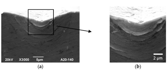 In the first stage, bonded-interface indentation tests were carried out on samples fixed in a rigid steel clamp without gaskets between samples. Figure 4b,c, shows the SEM snapshot of the initial state BMG surface after bonded interface. Numerous concentric bands shifting around the indenter can be observed, but also there is a local area directly under the indents where there are no noticeable SBs—an “SB-free zone” (Figure 4b).