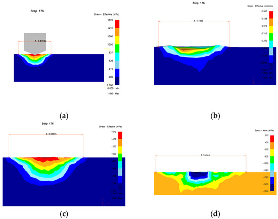 Diagrams of the stress-strain state under the indenter: (a) stress intensity, general view; (b) the accumulated strain; (c) stress intensity, detailed; (d) mean stress (hydrostatic pressure) values are negative, according to the theory of metal forming for compressive stress).