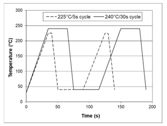 Samples of 350 mm × 90 mm were heat-treated at a laboratory CA simulator to simulate double-annealing paint-curing cycles at 240 °C soaking for 30 s or at 225 °C soaking for 5 s (Figure 1). The temperatures were controlled by thermocouples welded on the sample, while a constant cooling rate of about 20 °C/s was achieved using compressed nitrogen.