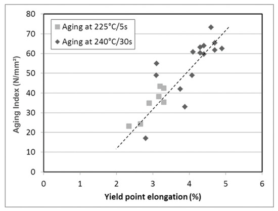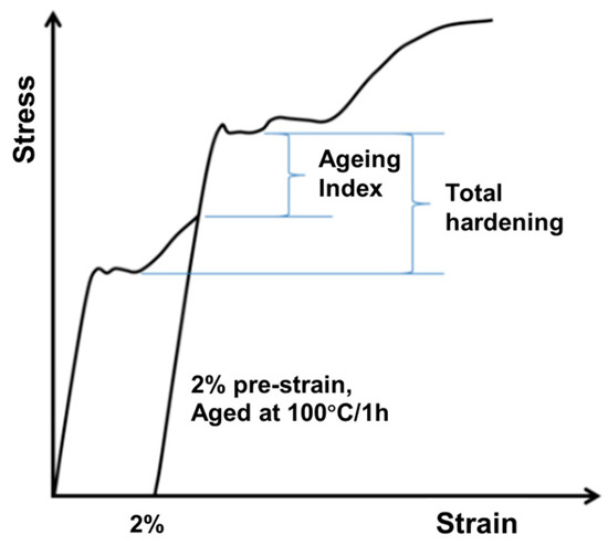 Aging index (AI) is used to study the ageing susceptibility of the low-carbon-steel strips. As shown in Figure 2, AI is the difference between the flow stress at a specific pre-strain and the lower yield stress after 100 °C/1 h artificial ageing in oil bath. The increase in yield stress after the pre-straining and artificial ageing is the total hardening due to both ageing and the work hardening. The purpose of the pre-strain is to remove the yield-point elongation; therefore, the amount of pre-strain needs to exceed the yield-point elongation, varying between 2~10%. Throughout this work, a 2% pre-strain was used for measuring the aging index.