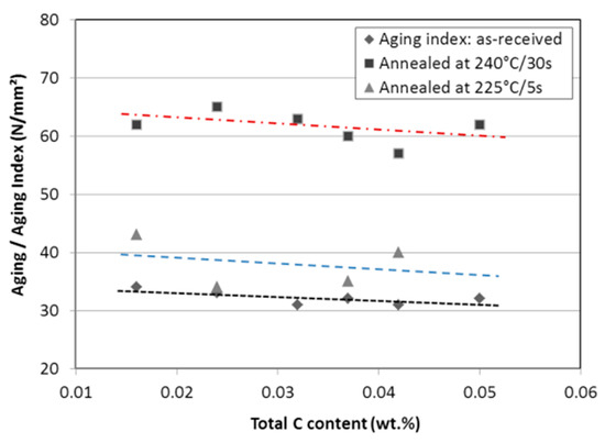 Samples with four different C contents were also heat-treated using a shorter annealing cycle of 225 °C/5 s. The increase in yield strength after the heat treatment was only about 34–43 N/mm². By lowering the paint-curing temperature with a shorter soaking time, the average ageing obtained from the CA low-carbon-steel strips was reduced by 30~45% (Figure 3). Though the amount of ageing appeared to decrease slightly with the increase in C contents within the range of this study, the variations were within the range of test errors, and the lines in Figure 3 were for guiding reference only. The total C content in continuously annealed CQ strips had relatively small impact on the level of ageing after paint-curing cycles, whereas the paint-curing cycles had a significant effect on age hardening of the CA low-carbon-steel strips.