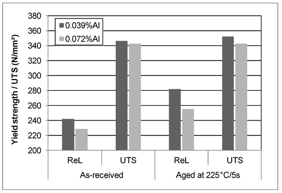 Low-carbon CQ strips generally contain about 0.032% Al for deoxidization and the removal of solute nitrogen. A CA low-carbon strip with double the amount of nominal Al content was selected for tensile tests to study its ageing response. The as-received material showed a small YPE of less than 0.5%, likely due to room-temperature ageing. A simulated paint-curing treatment was carried out at 225 °C for 5 s, and the strip samples exhibited an average increase in yield strength of 28 N/mm² and an increase in YPE of about 2.7%. As shown in Figure 4, the continuously annealed CQ strips with 0.072% Al showed a smaller ageing effect than that of the strip samples with standard Al content. The tensile tests also revealed that the as-received samples with the increased Al content had lower yield strength but similar ultimate tensile strength (UTS) compared to the standard CQ strips.