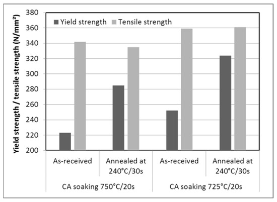 Low-carbon CQ strip samples from two CA cycles with different soaking temperatures (i.e., Cycle 1: 750 °C/20 s and Cycle 2: 725 °C/20 s) were selected to study their ageing response. Tensile tests of the as-received materials indicated that the strip processed with Cycle 1 had no yielding, while the CQ strip processed with Cycle 2 exhibited a room-temperature ageing of 20 N/mm² after 15 days compared to the test results of the CA production line. After a simulated paint-curing treatment at 240 °C for 30 s, the samples processed with CA Cycle 1 and Cycle 2 showed increases in yield strength of 63 N/mm² and 72 N/mm², respectively (Figure 5), while both samples had similar increases in YPE of about 4.6%. Nevertheless, by pre-straining the as-received material to 2%, followed by the ageing treatment, samples obtained from the two different CA cycles showed almost identical AI values of 30 N/mm² for Cycle 1 and 31 N/mm² for Cycle 2.