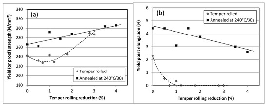 The effect of temper-rolling reduction on (a) yield (or proof) stress; (b) yield-point elongation.