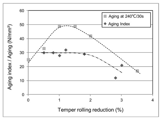 After a simulated paint-curing heat treatment at 240 °C/30 s, the temper-rolled samples showed a gradual increase in yield strength and a decrease in YPE with the increase in the temper-rolling reduction. However, the ageing hardening after the simulated paint-curing heat treatment increased initially with the increase in temper-rolling reduction, reaching a maximum at about 1% temper rolling. Further increase in the temper-rolling reductions led to the decrease in ageing (Figure 7). The aging-index measurements of the as-temper-rolled samples showed that the AI values remained unchanged at about 30 N/mm2 and decreased to about 20 N/mm² only when the temper-rolling reductions were about 3%. Since the 2% pre-strain used for the aging-index measurements did not remove the yield-point elongation of the non-temper-rolled sample, no aging index data were obtained for the non-temper-rolled material.