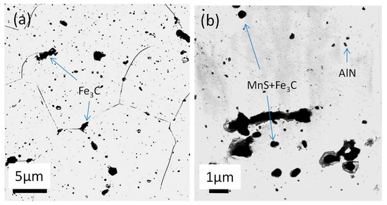 The coarse-carbide phases in CQ strips were partially dissolved during the high-temperature soaking of a CA cycle, and the solute C was subsequently quenched in solid solution. The supersaturated C then precipitated as iron carbide particles during overaging. TEM examination was carried out using carbon extraction replicas, and the phase identification was primarily based on EDX analysis. The CA samples contained many small iron carbide particles within the grains and many large carbides mainly at grain boundaries, as shown in Figure 8. The large grain-boundary carbides, often co-existing with MnS phases, are believed to be the undissolved carbide phases from the hot band. In addition, small AlN particles were also observed.