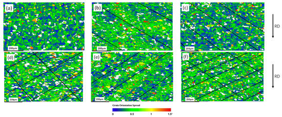 The grain orientation spread of 0.5° was found to be the suitable value to differentiate the localized strain bands from the surrounding matrix, as shown in Figure 10. The strain bands are approximately 30~40° of the rolling direction, and the cross deformation bands increase with the increase in temper-rolling reduction.
