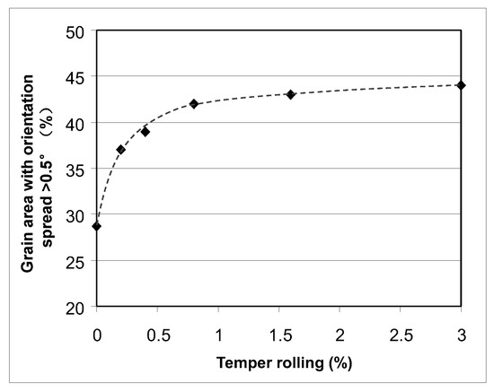 EBSD measurements showing the relationship between the temper-rolling reduction and the grain areas with orientation spread >0.5° (black rhombus as measured points).