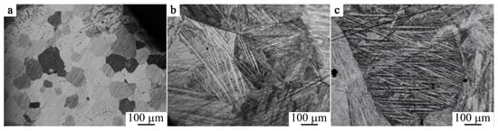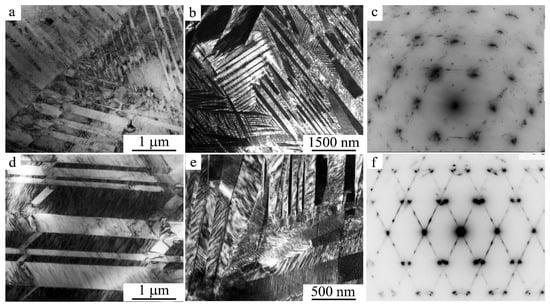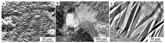 Previously, it was found that cast and forged copper β-alloys during subsequent cooling experience pro-eutectoid decomposition β→β1 + γ2 or β→β1 + α at temperatures above TED close to 840 K, and eutectoid decomposition β1→α + γ2 at temperatures below TED (Figure 1) [4]. However, their quenching procedure can prevent eutectoid decomposition [46,49,52,62]. In Figure 2a–c, typical examples of (a, b) the grain eutectic microstructure of (a) the alloy in the cast state, (b) the β1-austenite after quenching, as well as of (c) the intragrain morphology of martensite of quenched alloys are given. According to XRD data, two known martensitic phases were revealed in alloys after quenching, namely: the β’1 phase (the parameters of its long-period lattice 18R with a small monoclinic distortion are close to a = 0.443 nm, b = 0.533 nm, c = 3.819 nm, β = 89.0–89.5°) and the γ’1 phase–2H (the parameters of its orthorhombic lattice are close to a = 0.440 nm, b = 0.534 nm, c = 0.424 nm).