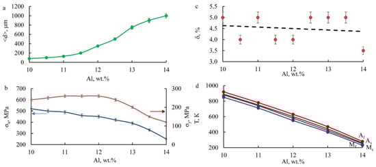 Concentration dependences of (a) average grain size <d> on the aluminum content, (b) limits of strength σu (blue line) and yield σy (red line), (c) elongation δ on the aluminum content (Red dot indicates measurement error) and (d) temperatures of the start and finish of forward (Ms, Mf) and reverse (As, Af) TMT in Cu-xAl-3Ni alloys.