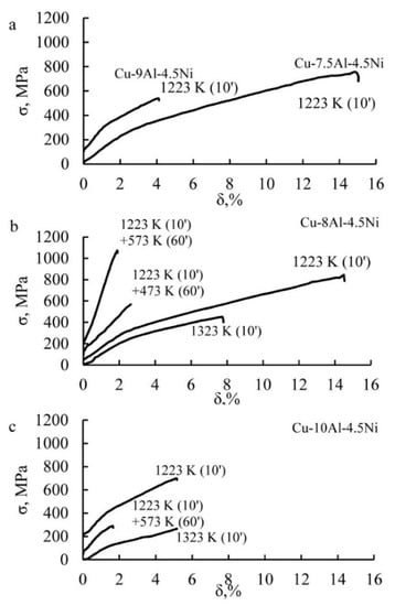 «Stress–strain» curves taken in tensile tests of the Cu-xAl-4.5Ni alloys (the modes of quenching, annealing and weight compositions are indicated). (a–c) Heating for quenching for 10 min (10’) and annealing for 60 min (60’).