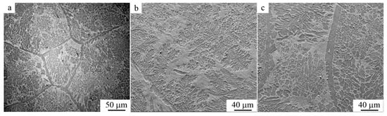 A detailed study of the relationship between the chemical and the phase composition of alloys by OM and SEM methods found that quenching could not eliminate the chemical liquation observed in Figure 8. Table 3, as an example, shows the data of the integral spectral analysis and X-ray energy dispersion microanalysis for Cu-13Al-3Ni alloy. It can be assumed that the formation of the FG structure of the austenite alloys during recrystallization after forging was stipulated by the barrier effect of grain growth inhibition due to the detected chemical heterogeneity of liquation origin. This had a weakening effect, as the change in the concentration of Al shifted the composition of the alloys from the boarder that separated the phase states (α + β) and β or β and (γ2 + β) (see Figure 1). However, in this case, in alloys with a more homogeneous chemical composition, the growth of austenite grains was more noticeable during annealing (see Table 1) and, as a result, CG alloys experienced brittle fracture during tensile tests, whereas FG alloys containing alloying elements near the solubility boundary were subjected to partial pro-eutectoid decomposition during quenching, mainly at grain boundaries, which also led to their embrittlement (Figure 5).