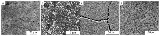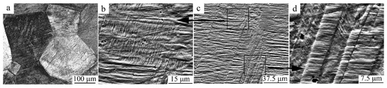 SEM images in SE mode of the intragrain microstructure in the Cu-14Al-4Ni alloy after the compression tests at (a,b) 773 K (v = 1 mm/min) and (c,d) 873 K ((c)—v = 5, (d)—v = 1 mm/min) [47].