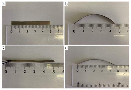 Photos of the demonstration of SME in a hardened Cu-14Al-3Ni alloy subjected to (a) cooling in liquid nitrogen, (b) bending, (c) heating to room temperature and (d) cooling in liquid nitrogen with the realization of reversible SME.