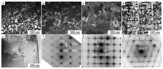 A complex pattern of diffuse scattering was detected on SAED patterns along with Bragg reflections (Figure 11 and Figure 12). In the reciprocal lattice (r.l.–*), this diffuse scattering forms the flat diffuse layers {111}* passing through all hkl nodes, with the exception of the central node 000 [52,63]. The intensity of this diffuse scattering is more pronounced near the reflections than between them. The most intense diffuse streaks are located along the non-radial directions <110>*. Additional evidence of the increased intensity of the streaks <110>* is their visualization in the form of diffuse spots, when the streaks are located in r.l. at an angle to the diffraction plane and “pierce” the Ewald sphere. These «puncture holes» are due to the presence of the inclined streaks along <110>*, both in the vicinity of Bragg reflections and in between them (e.g., 1/2<112>* in the r.l. sections {110}*, {311}* or {210}*). Such a scattering was already observed to be higher at the temperatures of the observation in situ: Ms by 100–150 K (Figure 11d and Figure 12a).