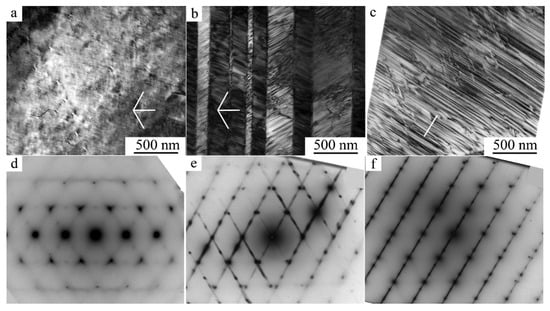 (a) Dark-field and (b,c) bright-field TEM images of the deformation-induced tweed contrast in the (a) β1-austenite, (b) twinned γ1′ martensite, and (c) β1′ martensite of the alloy Cu–13.5Al–3.5Ni and (d–f) their corresponding SAED patterns, with zone axis close to [111]; D03. Observations (a,d) at 450 K, and (b,c,e,f)–at RT [62].