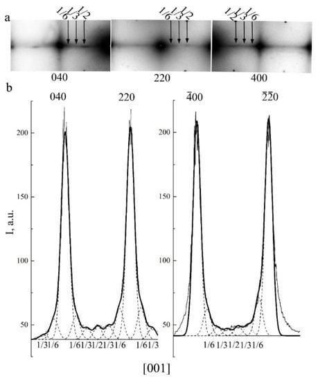 Fragments of the SAED with zone axis [001] with diffuse effects (a) and intensity profiles upon scanning of the diffuse scattering along strands with the satellites: 1/6 ⟨220⟩, 1/3 ⟨220⟩, 1/2 ⟨220⟩ (b). Solid thin lines represent experimental intensity profiles which were obtained with the Digital Micrograph software upon SAED indexing. Solid bold lines represent intensity profiles which were calculated for main reflections using Gauss function in the Origin software. Dashed lines represent calculated profiles for satellites: 1/6 ⟨220⟩, 1/3 ⟨220⟩, 1/2 ⟨220⟩. Bragg reflections 400 and 220 are indicated [62].