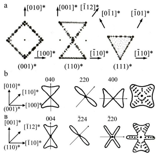 Atomic displacement wave spectra in the form of plane cross-sections (001)*, (110)*, and (111)* of reciprocal k-space (a) and in the vicinity of reciprocal lattice nodes of the planes (001)* and (110)* (b,B). Projections of ek for k wave of enhanced amplitude and, consequently, more intensive diffuse scattering are marked by dots, arrows, and dashes [62].